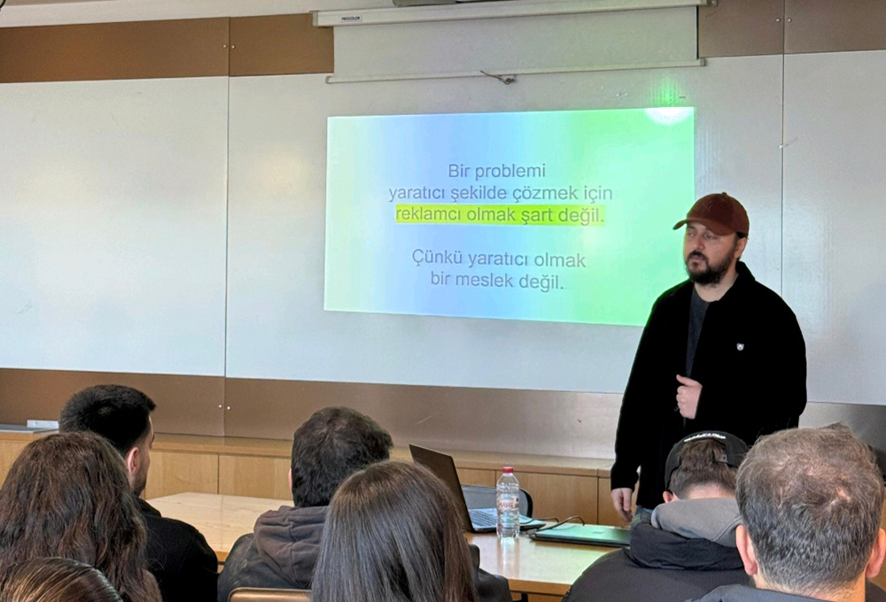 Halkla İlişkiler ve Reklamcılık Bölümü ile Etkili İletişim Kulübü iş birliğinde, 4 Mart 2026 Çarşamba günü saat 13:00’te “Güçlü Fikir, Etkili Marka” başlıklı etkinlik düzenlendi. H20 Ajans Kreatif Direktörü Ali İhsan Ozan’ın konuk olduğu etkinlikte, öğrencilere güçlü bir fikrin marka kimliğine nasıl dönüştüğü, yaratıcı süreçlerin arka planı ve sektörde fark yaratmak için hangi stratejik bakış açısının gerektiği aktarıldı. Etkinliğe katılan öğrenciler, marka inşasında yaratıcılığın rolünü ve iletişim dünyasında etkili olmanın temel dinamiklerini yakından tanıma fırsatı buldu.